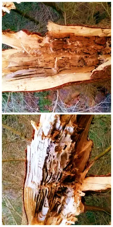 Risikotræ som er knækket i stormen. Det er ikke altid at vi kan se hvordan træet egentlig har det før det er for sent. Her er et tydeligt eksempel på et træ der ville have været farligt både for sine omgivelser, men også at topkappe. Hvis tilfældet havde krævet topkapning, ville en lift eller sikringspunkt i nabotræer være måden at løse det på.