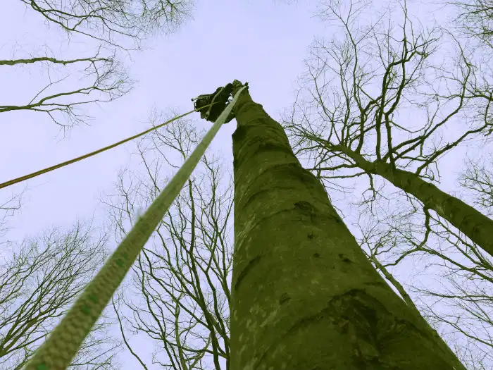 Når jeg er klatret op i træet der skal topkappes og er klar til at starte motorsaven, fastgører jeg mig med to punkter. Det ene punkt vil typisk være klatrerebet, det andet vil være mastegjord lavet med stålkerne. Topkappersaven vil nu blive startet op og fældesnittet kan laves.
